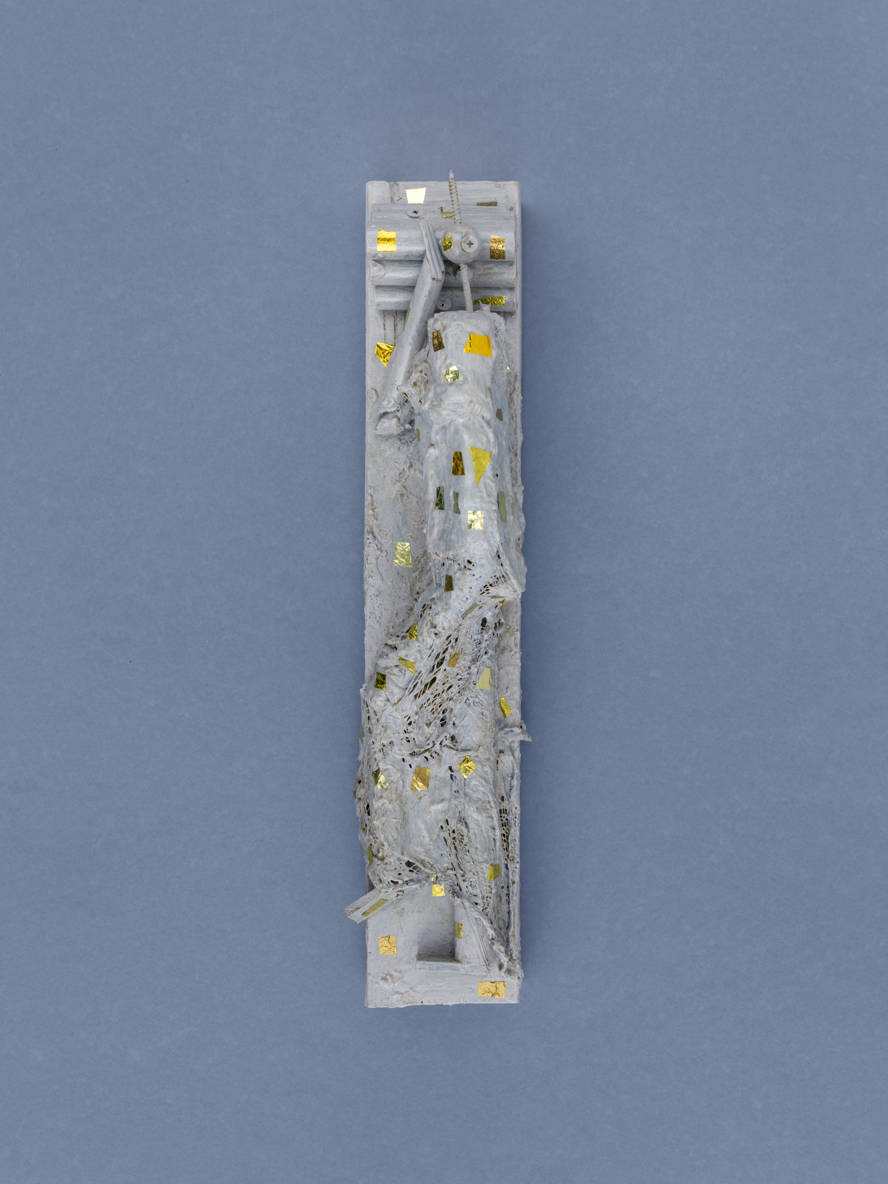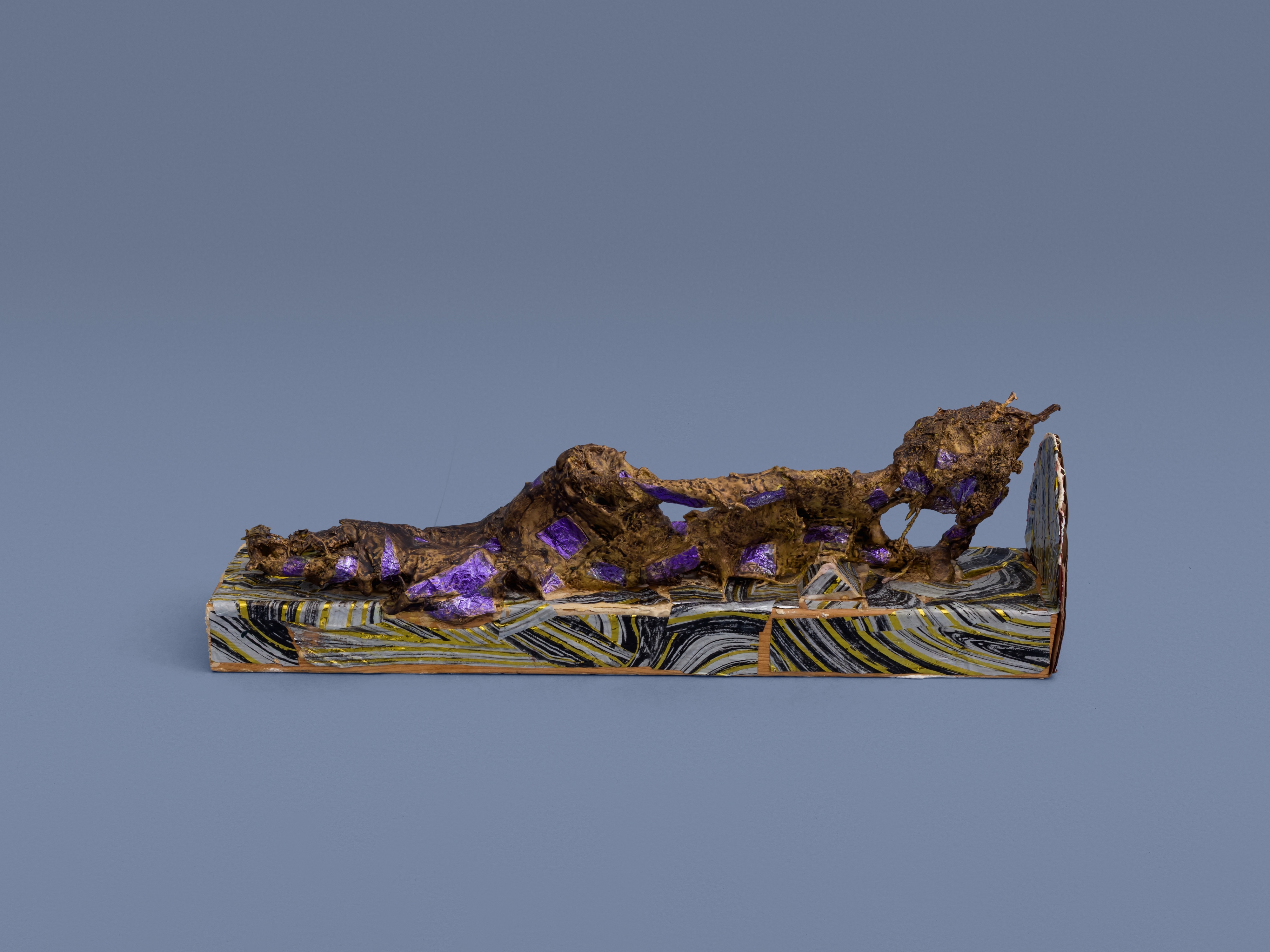 The second typology is the reclining teaching buddha popular in Southeast Asia. Relaxed and approachable, their heads propped on one hand, these figures reminded me of reclining nudes in the European modernist tradition, including those of Henri Matisse and Henry Moore—a third typology, in turn, with which I also worked for this show. To make these pieces, I wrapped plaster-soaked jute around wire armatures, drawing on Moore’s plaster techniques. I then painted and decoupaged them with fragments of found mylar balloons in imitation of the gold leaf often applied to Buddhist icons.