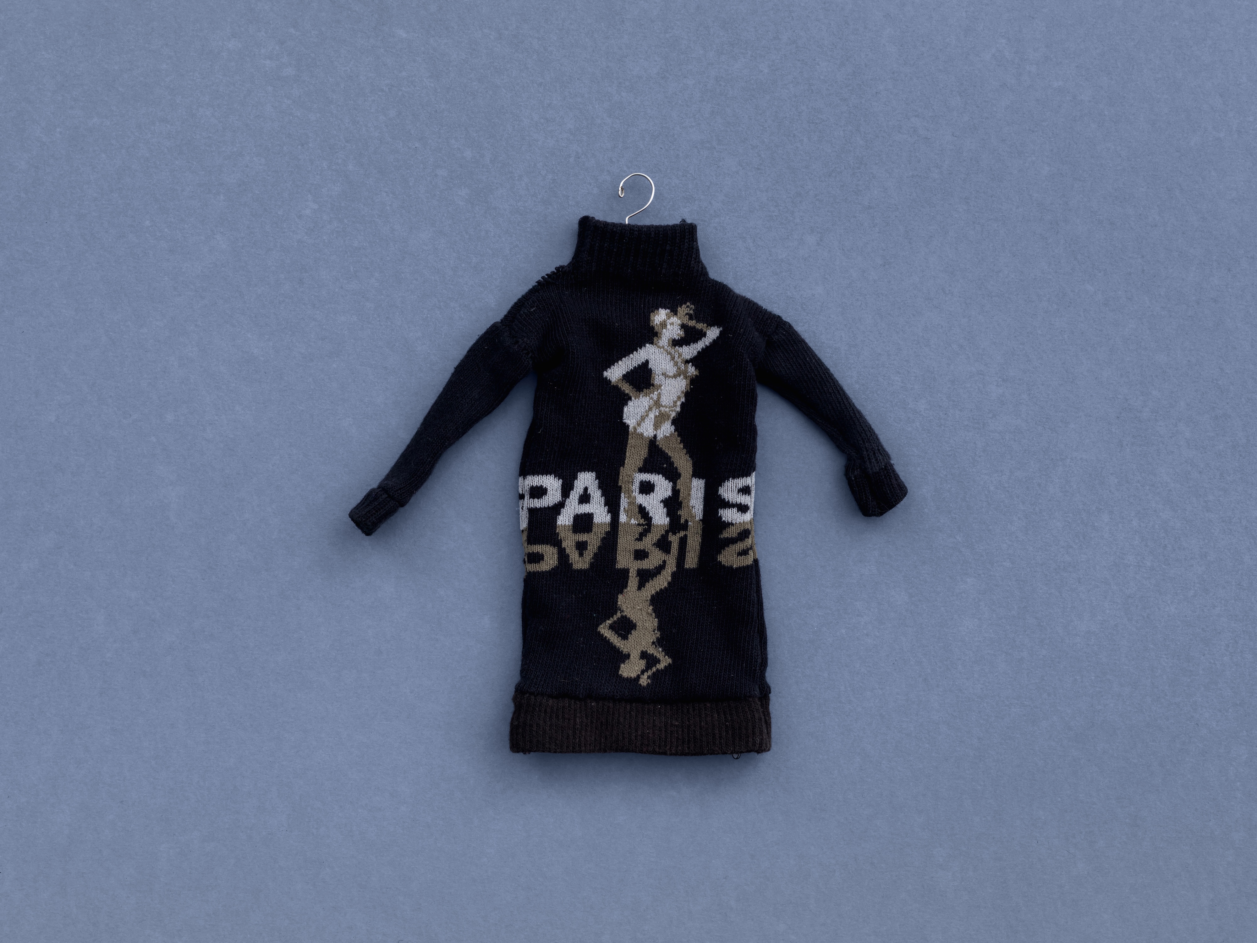 Topping two of the bookcases are Henry Moore studies made from textiles stretched over wire. For these and the other stitched works, I drew from my personal wardrobe. The skin of Parinirvana (UNESCO Betty) is pieced together from a t-shirt I’ve had since college, which features Betty Boop in an American flag dress against a Union Jack background. The sculpture takes the form of Moore’s 1957–58 reclining figure for the UNESCO headquarters in Paris. Mapping Betty’s body onto Moore’s biomorph reveals the extent of the distortions in each, while scrambling the British flag into a patchwork that recalls the dazzle camouflage of the First World War.